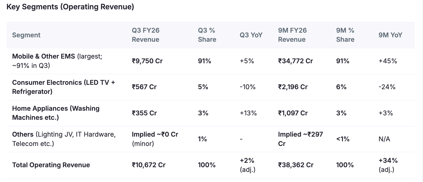 Currently, mobile phones contribute the largest share of Dixon's revenue. However, the company also operates across several other segments, including LED TVs, washing machines, refrigerators, smartwatches, telecom equipment, and IT hardware, making it a diversified electronics manufacturing partner.